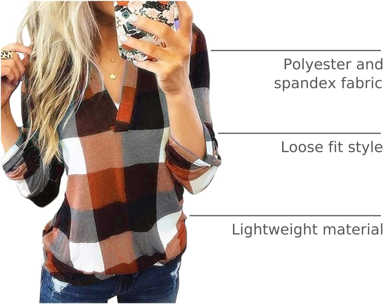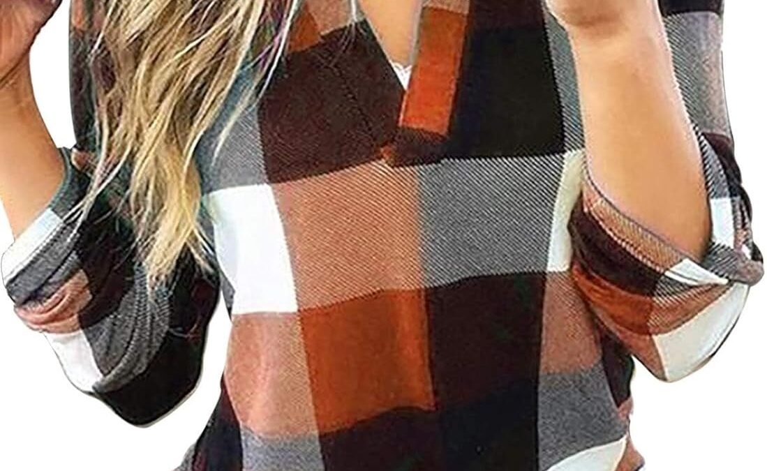 Dokotoo Womens Basic Casual V Neck Plaid Print Cuffed Long Sleeve Work Tops Blouses Shirts S-3XL