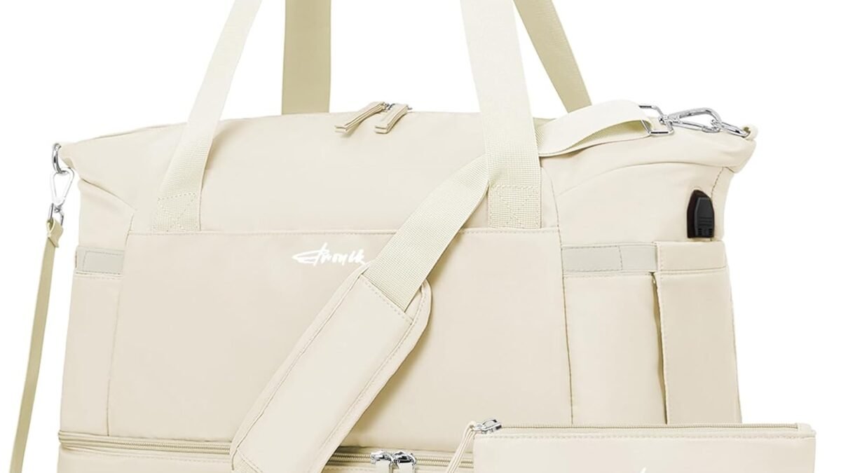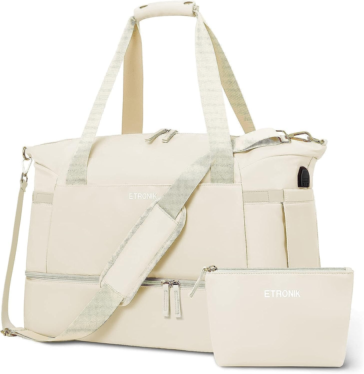 ETRONIK Gym Bag for Women, Personal Item Travel Bag with Shoes Compartment, Weekender Overnight Duffel Bag with Wet Pocket & USB Charging Port, Carry On Bag for Women, Travel, Gym, Weekend (Beige)