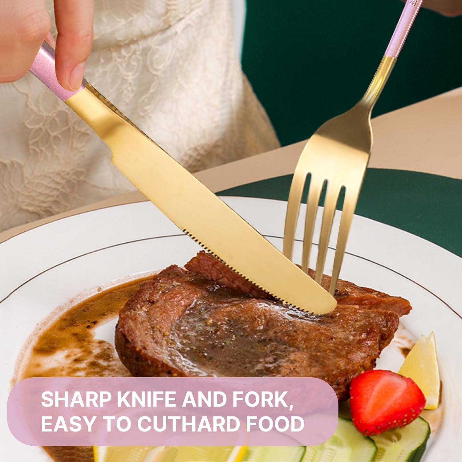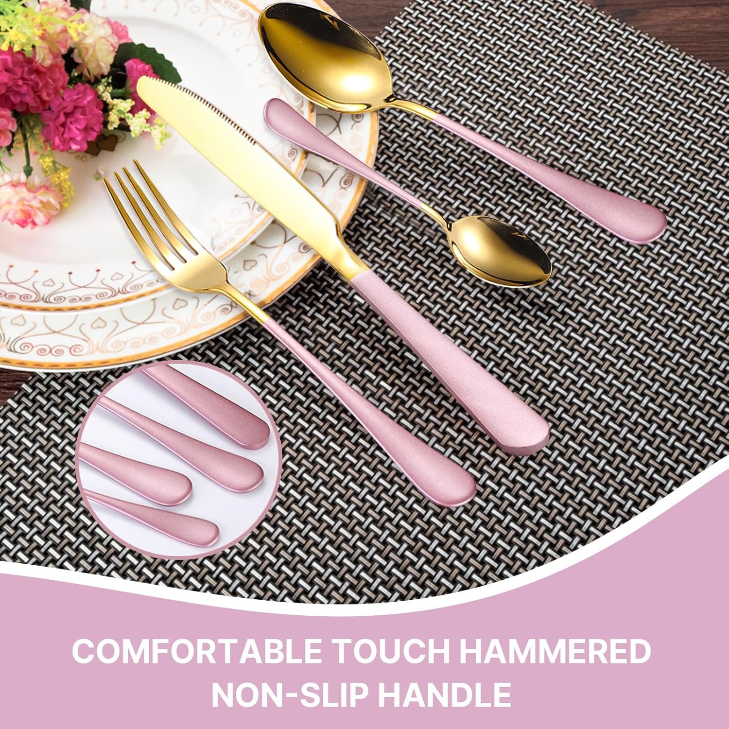 The set features a highly polished surface that not only amplifies its luxurious appearance but also makes it a stunning addition to any table setting. With stylish colors such as elegant titanium and pink handles, this silverware enhances your dining ambiance.