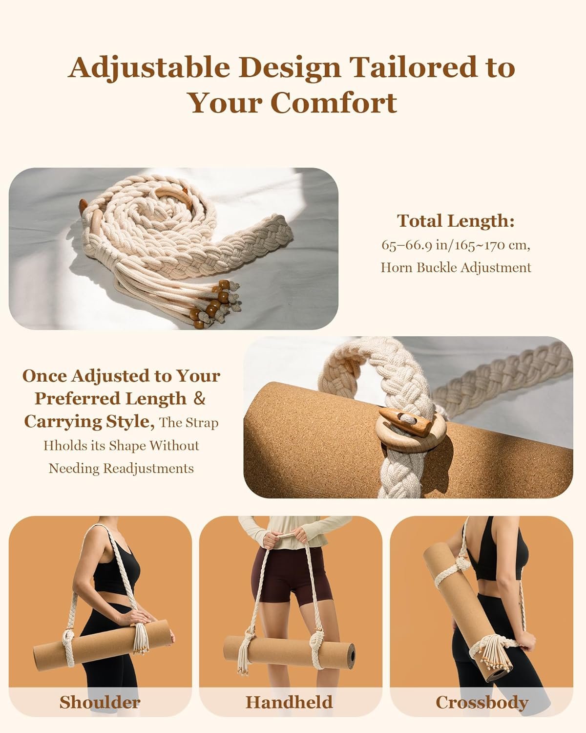 - Customizable Length: The sliding beechwood rings and reinforced horn buckles allow for easy adjustments, accommodating a wide range of yoga mat sizes.