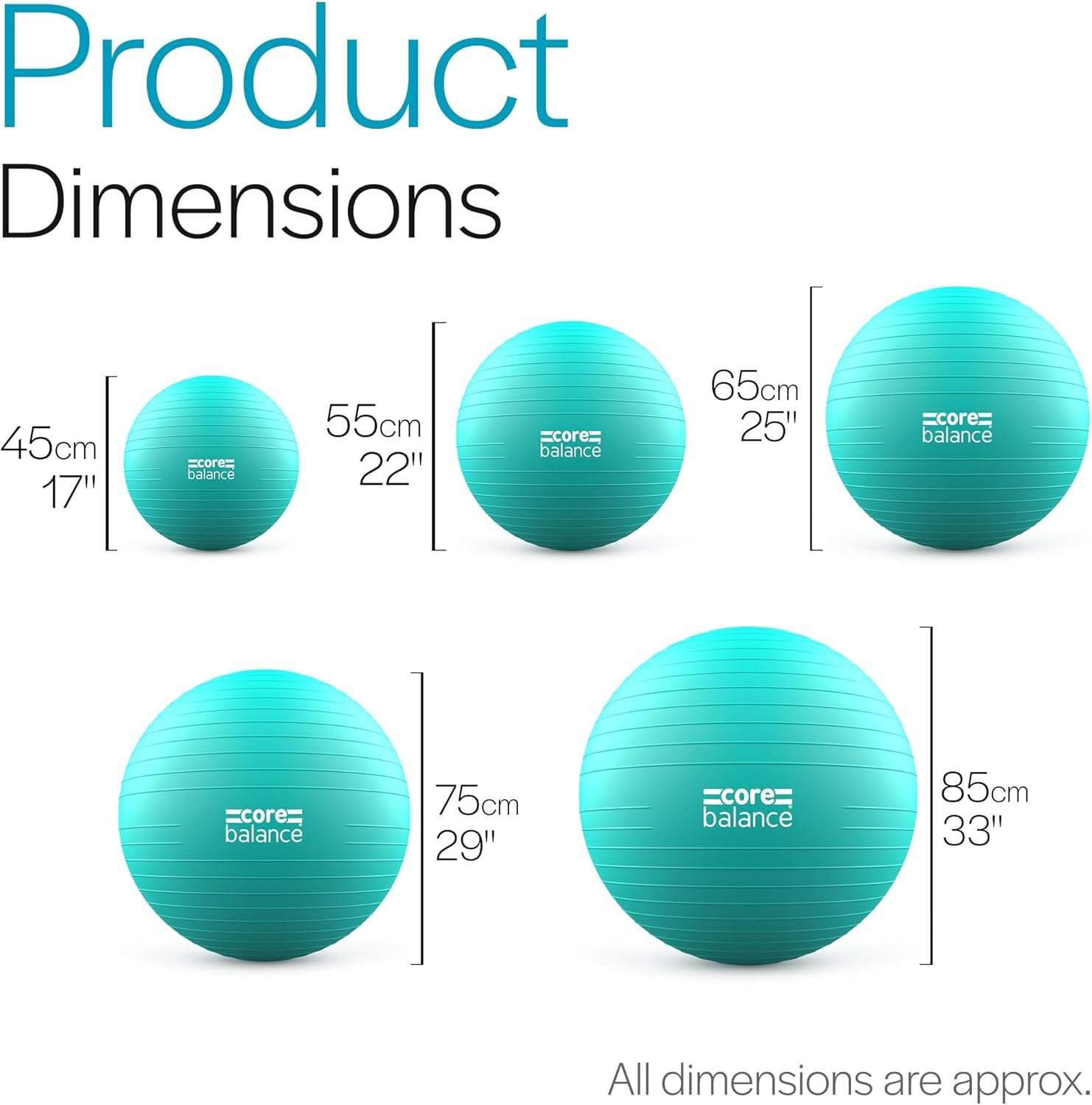 To suit different heights and needs, this exercise ball comes in these sizes: